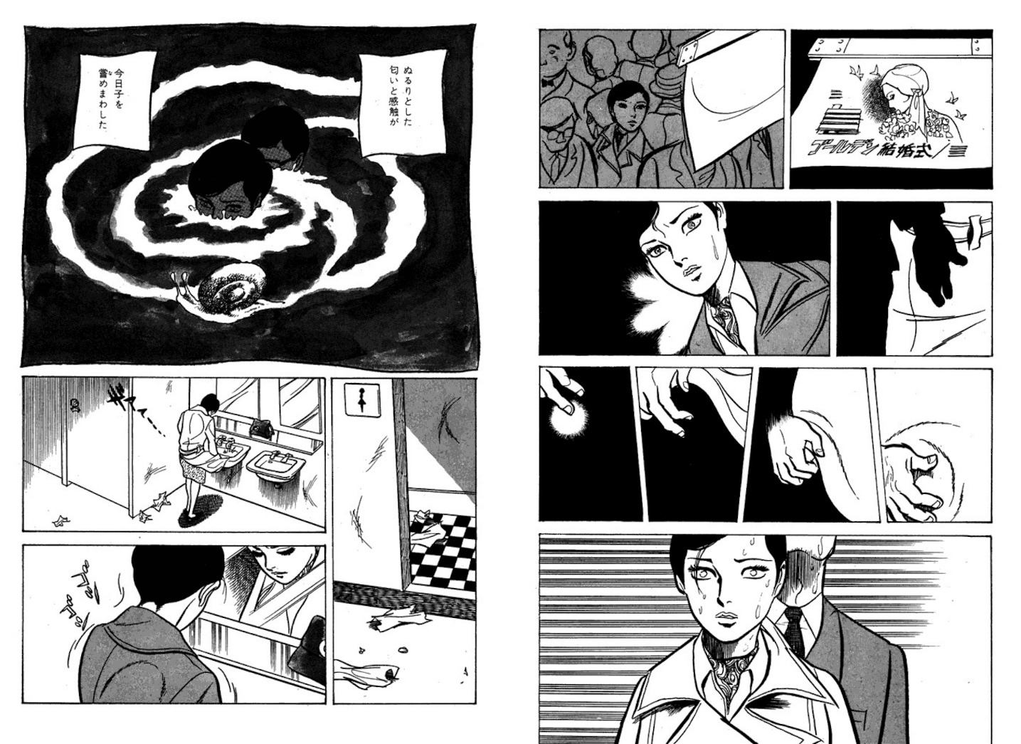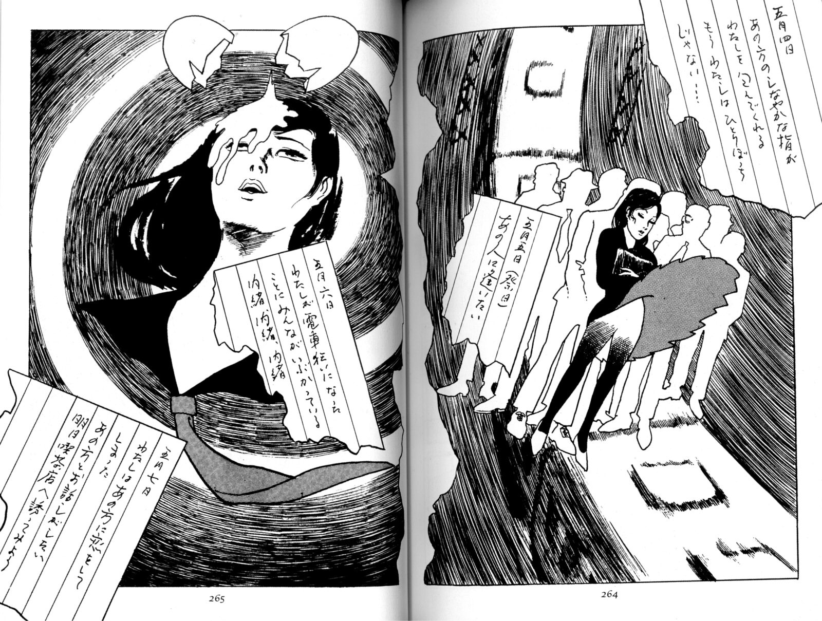 たとえば第11話「青春日記」では、ある令嬢がたまたま乗りこんだ電車でストーカーに遭い、その男に歪んだ恋心を抱くのであるが、その顛末を日記でつづった見開きページのジャンク味あふれる荒々しい貸本劇画タッチ、そして精液と生卵のどろどろをアナロジーする猥雑さは、まさに手塚の決して生み出し得ない画狂若人卍の所業に見える【図8】。