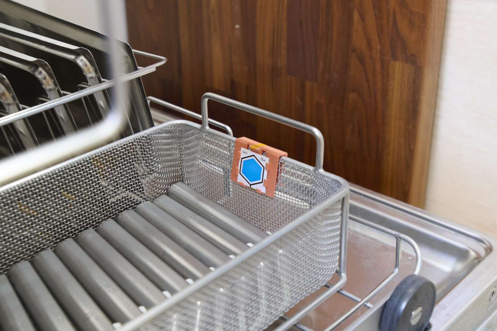 オレンジの枠がついた「青い六角形」にご注目。これは、洗えているかをしっかりチェックしてくれる道具「洗浄工程インジケータ」。ポップな色合いが可愛い。