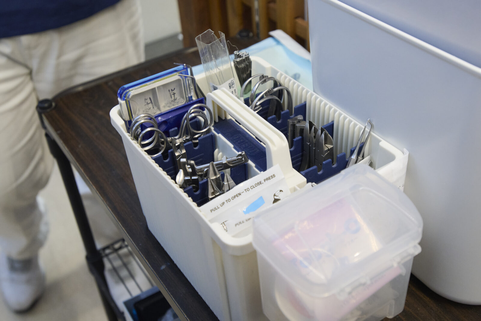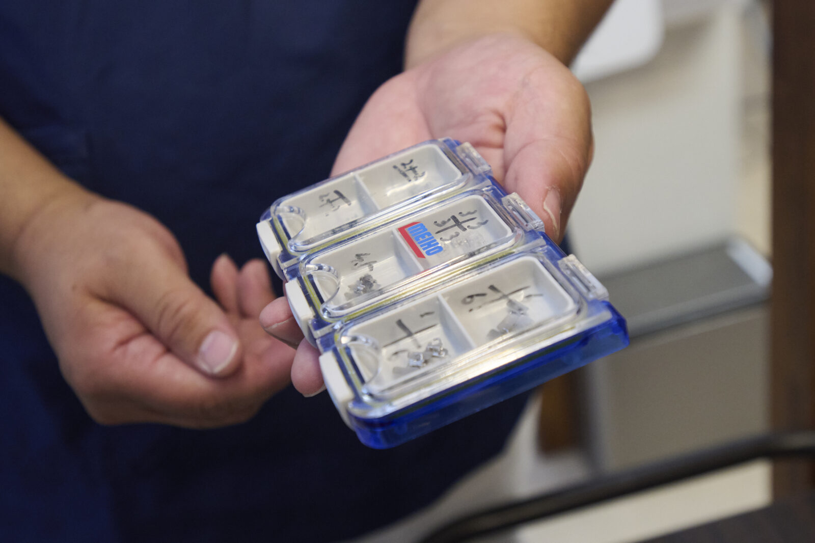 道具の転用は、院長も大得意。これは院長が上州屋で見つけてきた釣り具用ケースです。歯列矯正の器具「ブラケット」がジャストフィット。