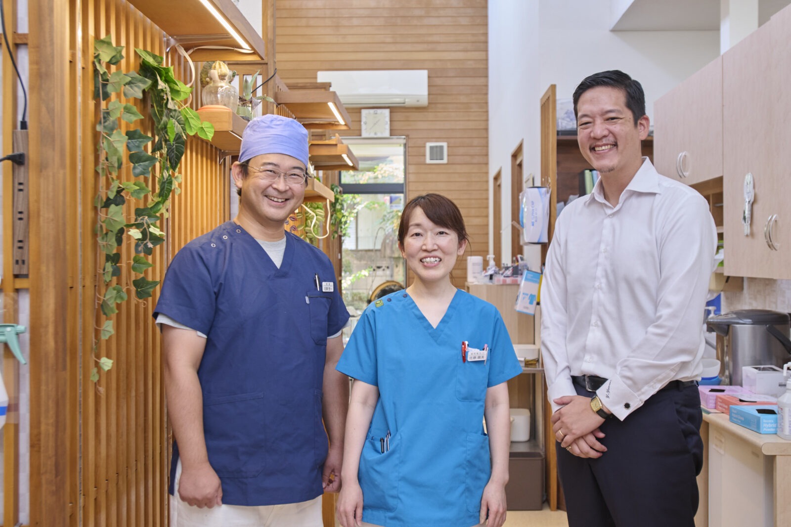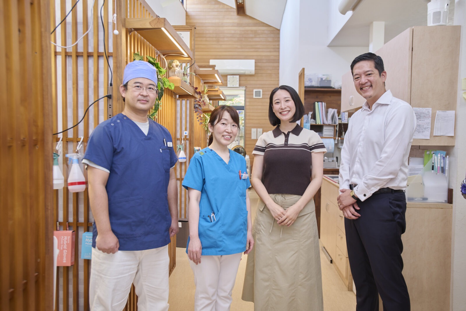 お話を聞いたメンバーはこちら。写真の中央左が、日本に6人しかいないものすごい人、副院長の佐藤さんです。一番左が院長の石原さん。中央右が筆者で、一番右は、株式会社名優の代表で、再生処理(洗浄・滅菌)のプロダクトブランド「SALWAY」を運営する山根さん。