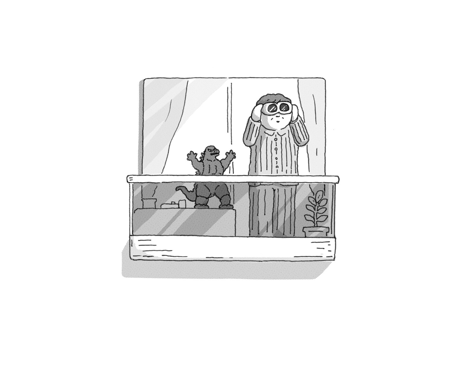 僕に振り返らない選択肢はなかった。そもそも朝早くベランダ越しから双眼鏡で何かを見ること自体不思議だし、ゴジラをベランダに設置するような人だ、何か特別なものを見ているに違いない。ワクワクと若干の怖さを抱えながら、僕はバッと勢いよく振り返り、おじさんとゴジラが見ている方角に刮目した。