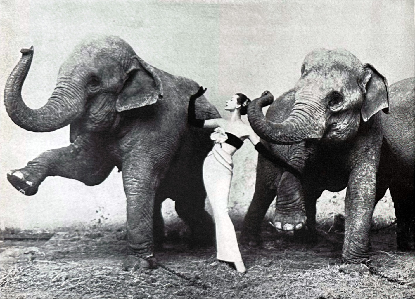 ところが、この写真は本家アメリカ版にしか掲載されなかった。のちに写真史上の傑作のひとつに数えられる本作は、初めから世界中に知られたイメージとはならなかったのである。とはいえ、1957年に公開されたオードリー・ヘップバーンとフレッド・アステアが主演を務めた映画『パリの恋人』では、これを彷彿とさせるシーンが出てくる。この映画はアヴェドン自身もビジュアル・コンサルタントを務め、アステア演じるファッション写真家のジョーはアヴェドンをモデルにしたといわれている。劇中ではジョーがドヴィマを撮影するシーンがあり、ここでドヴィマはあの象と戯れる写真を彷彿とさせるポーズをとっているのだ。このころ、アヴェドンはすでにファッションという枠を超えて広く知られる著名な写真家になっていた。それは、アヴェドン自身がこのように巨大なストーリーのキャストともなっていたからであるが、写真家としての彼を純粋に見つめた場合、1950年代においてもっとも物議を醸したファッション写真家だからでもあった。